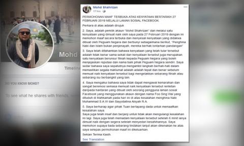 Pada tahun ini, di era kerajaan PH juga telah berlaku kes yang sama. Seorang warga emas, Foo Sing didakwa menggunakan laman Facebook “Foo Sing Wai” memuat naik karikatur berunsur penghinaan ke atas Nabi, Isteri Nabi dan agama Islam, pada 18 Februari 2019. Beberapa laporan Polis telah dibuat termasuk laporan dari Menteri Di JPM, Mujahid Yusof dan berikutan dari itu warga emas ini telah didakwa pada 27 Februari 2019 mengikut Seksyen 298A(1)(a) Kanun Keseksaan, yang boleh dihukum penjara maksimum lima tahun, jika sabit kesalahan dan mengikut Seksyen 233(1)(a) Akta Komunikasi dan Multimedia 1998 (Akta 588), yang memperuntukkan hukuman penjara maksimum setahun atau denda atau kedua-duanya, jika sabit kesalahan. Kes tersebut akan disebut semula pada 05 April 2019 dan beliau telah dikenakan jaminan sebanyak RM 20, 000. Beliau dimasukkan ke penjara kerana gagal membayar jaminan.